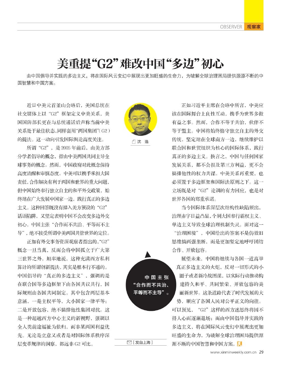 正如有外交事务资深观察者指出的,“G2”概念一旦当真,反而会将中国孤立于广大第三世界之外。坦率地说,这种充满西方私利算计的所谓创新提法,其实是根本行不通的。中国倡导的“真正的多边主义”,强调的是在联合国等多边框架下由各国共议共行,国际规则由各国共同制定。其中包含两层基本意涵,一是主权平等,大小国家一律平等;二是开放包容,绝不搞排他性集团对抗。这是一种超越西方中心主义的新视野,强调以全人类前途福祉为依归,而非某两国利益优先。无论是立意又或者是对国际体系秩序深层变革规律的洞察,都远非G2可比。