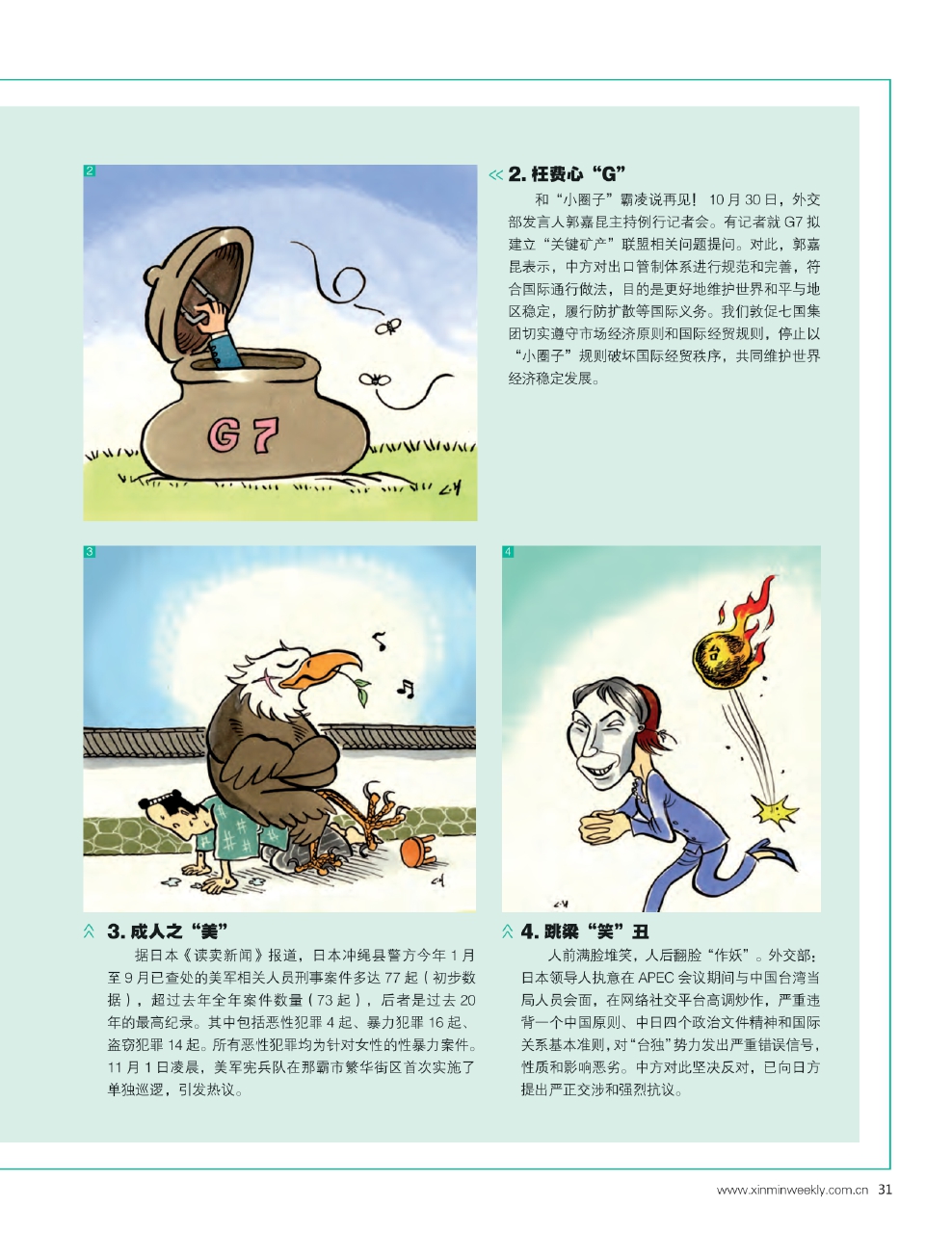 2.枉费心“G” 和“小圈子”霸凌说再见! 10月30日,外交部发言人郭嘉昆主持例行记者会。有记者就G7拟建立“关键矿产”联盟相关问题提问。对此,郭嘉昆表示,中方对出口管制体系进行规范和完善,符合国际通行做法,目的是更好地维护世界和平与地区稳定,履行防扩散等国际义务。我们敦促七国集团切实遵守市场经济原则和国际经贸规则,停止以“小圈子”规则破坏国际经贸秩序,共同维护世界经济稳定发展。