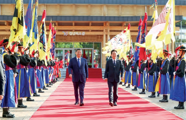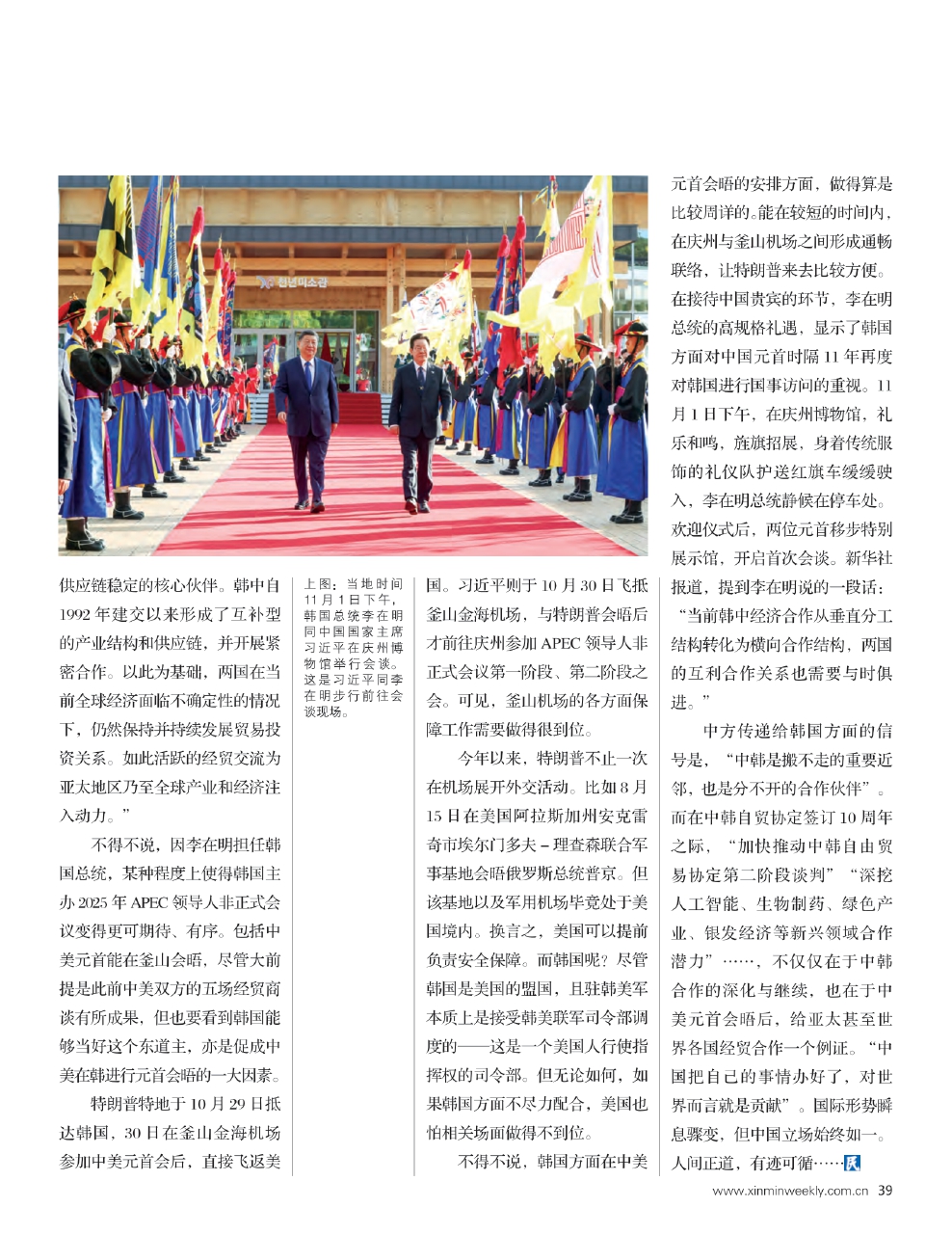 不得不说,韩国方面在中美元首会晤的安排方面,做得算是比较周详的。能在较短的时间内,在庆州与釜山机场之间形成通畅联络,让特朗普来去比较方便。在接待中国贵宾的环节,李在明总统的高规格礼遇,显示了韩国方面对中国元首时隔11年再度对韩国进行国事访问的重视。11月1日下午,在庆州博物馆,礼乐和鸣,旌旗招展,身着传统服饰的礼仪队护送红旗车缓缓驶入,李在明总统静候在停车处。欢迎仪式后,两位元首移步特别展示馆,开启首次会谈。新华社报道,提到李在明说的一段话:“当前韩中经济合作从垂直分工结构转化为横向合作结构,两国的互利合作关系也需要与时俱进。”
