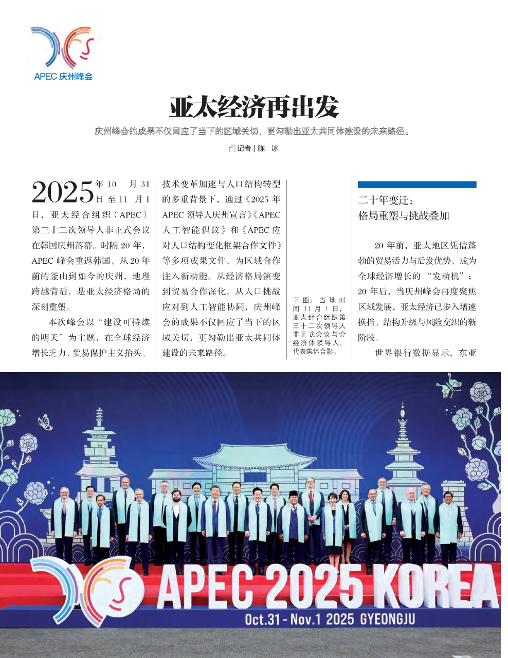 20年前,亚太地区凭借蓬勃的贸易活力与后发优势,成为全球经济增长的“发动机”;20年后,当庆州峰会再度聚焦区域发展,亚太经济已步入增速换挡、结构升级与风险交织的新阶段。