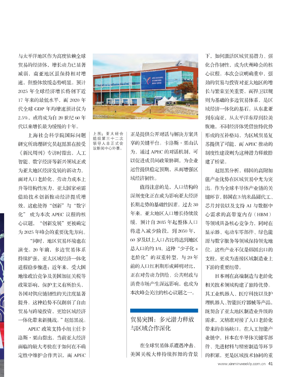 本次峰会以“建设可持续的明天”为主题,在全球经济增长乏力、贸易保护主义抬头、技术变革加速与人口结构转型的多重背景下,通过《2025年APEC领导人庆州宣言》《APEC人工智能倡议》和《APEC应对人口结构变化框架合作文件》等多项成果文件,为区域合作注入新动能。从经济格局演变到贸易合作深化,从人口挑战应对到人工智能协同,庆州峰会的成果不仅回应了当下的区域关切,更勾勒出亚太共同体建设的未来路径。