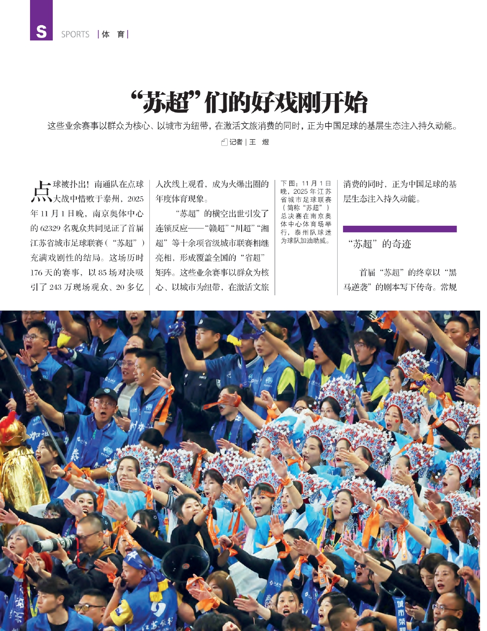 足球人口的显著增长是“省超”最直接的贡献。仅看“苏超”一家的数据已经足够震撼:超243万人次现场观赛,场均超2.8万人次,南京奥体中心7场比赛均超6万名观众;线上直播观看20多亿人次,各平台话题播放量近800亿次。2025“苏超”小组赛南通主场对阵苏州的赛前,一名女观众对《新民周刊》记者坦言:她之前是不看足球比赛的,因为今年南通队踢得很精彩,所以连续几场都来现场助威,“后面只要有比赛,我还会一直追下去”。许多原来不关注足球的人借由“省超”开始认识足球、了解足球,这样的增量对足球发展带来的推动显而易见。