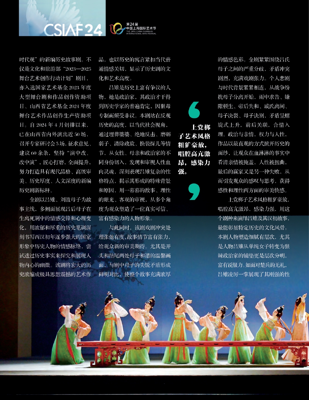 上党梆子是一个昆、梆、罗、卷、黄五声腔共存的古老剧种,悠远而富有表现力。在此次上海国际艺术节上,“爱我中华·系列演出”中的上党梆子《大汉母子》是一部彰显“大历史观、大时代观”的新编历史故事剧。不仅是文化和旅游部“2023—2025舞台艺术创作行动计划”剧目,亦入选国家艺术基金2023年度大型舞台剧和作品创作资助项目、山西省艺术基金2024年度舞台艺术作品创作生产资助项目。自2024年4月创排以来,已在山西省内外演出近50场,召开专家研讨会5场,征求意见、建议60余条,坚持“演中改、改中演”,匠心打磨,全面提升,努力打造具有现代品格、高级审美、历史厚度、人文深度的新编历史剧新标杆。