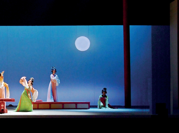 在音乐呈现上,乐队进行了扩编,增强了音乐的层次感与磅礴气势,既严格遵循昆曲曲牌格律,又在《江州送酒》《中秋奏凯》无原始曲谱的情况下,唱腔作曲根据词意和四声腔格规律进行谱曲式作曲,并对《长生殿·重圆》经典唱段予以守正创新。