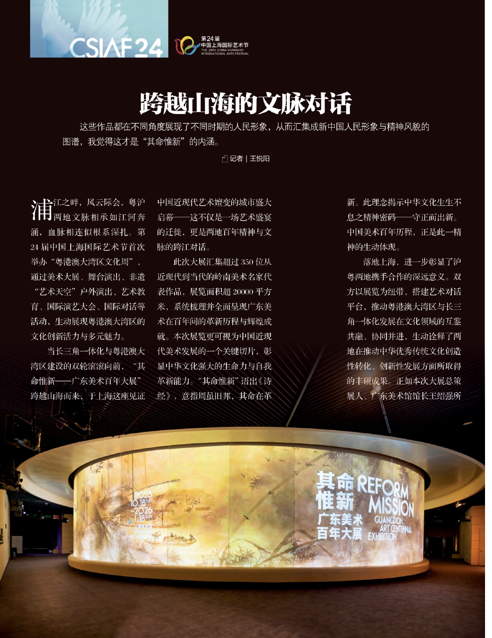 浦江之畔,风云际会,粤沪两地文脉相承如江河奔涌,血脉相连似根系深扎。第24届中国上海国际艺术节首次举办“粤港澳大湾区文化周”,通过美术大展、舞台演出、非遗“艺术天空”户外演出、艺术教育、国际演艺大会、国际对话等活动,生动展现粤港澳大湾区的文化创新活力与多元魅力。