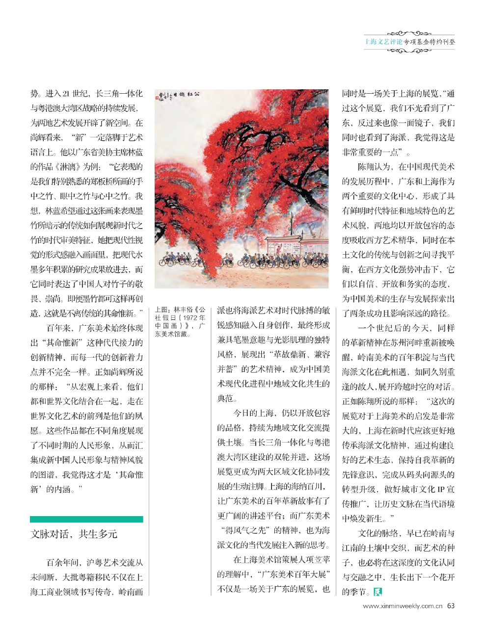 陈翔认为,在中国现代美术的发展历程中,广东和上海作为两个重要的文化中心,形成了具有鲜明时代特征和地域特色的艺术风貌,两地均以开放包容的态度吸收西方艺术精华,同时在本土文化的传统与创新之间寻找平衡,在西方文化强势冲击下,它们以自信、开放和务实的态度,为中国美术的生存与发展探索出了两条成功且影响深远的路径。