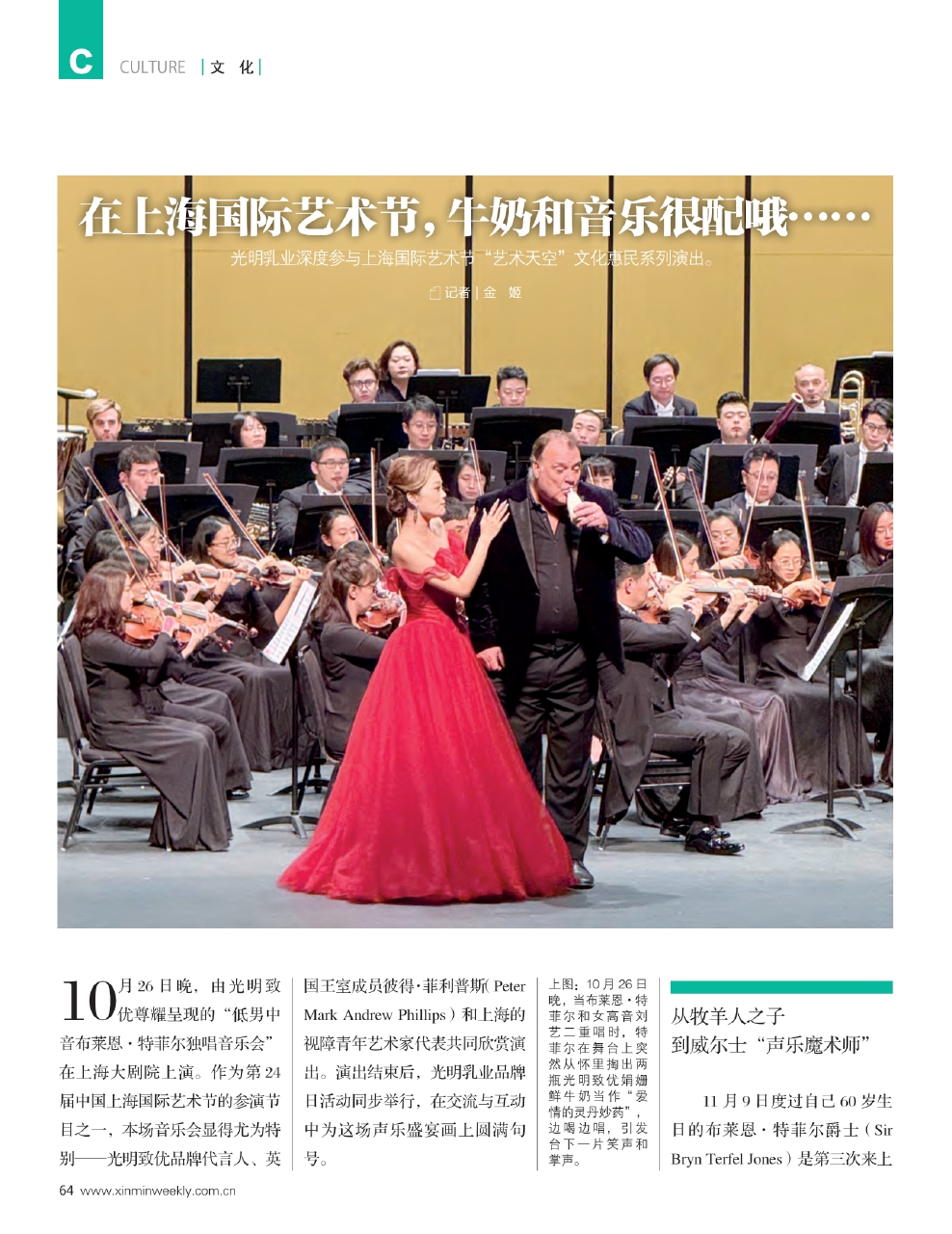 10月26日晚,由光明致优尊耀呈现的“低男中音布莱恩·特菲尔独唱音乐会”在上海大剧院上演。作为第24届中国上海国际艺术节的参演节目之一,本场音乐会显得尤为特别——光明致优品牌代言人、英国王室成员彼得·菲利普斯(Peter Mark Andrew Phillips)和上海的视障青年艺术家代表共同欣赏演出。演出结束后,光明乳业品牌日活动同步举行,在交流与互动中为这场声乐盛宴画上圆满句号。