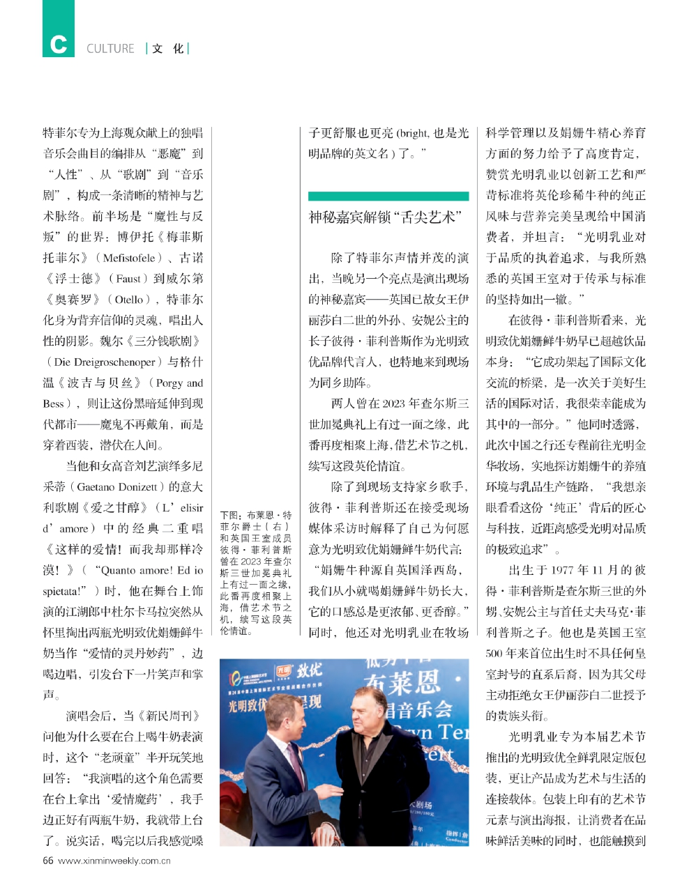 除了特菲尔声情并茂的演出,当晚另一个亮点是演出现场的神秘嘉宾——英国已故女王伊丽莎白二世的外孙、安妮公主的长子彼得·菲利普斯作为光明致优品牌代言人,也特地来到现场为同乡助阵。