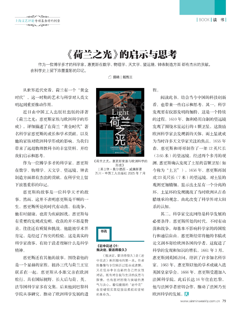 阅读此书,结合当今中国的科技创新看,也带来一些启示和思考。其一,科学发现要有仪器发明的加持,这是一个持续的过程。1610年,伽利略用自制的望远镜发现了围绕木星运行的4颗卫星,这激励欧洲科学家去发现新的天体,而土星就成为当时许多天文学家关注的焦点。1655年春,惠更斯和哥哥制作了一架12英尺长(3.65米)的望远镜,经过两个多月的观测,惠更斯确认发现了土星的首颗卫星(如今称为“土卫”)。1656年,惠更斯再制成23英尺长(7米)的望远镜,对土星的观测更加精细,显示出土星有一个分离的环。土星环的发现挑战了当时欧洲从古希腊继承的观念,由此改变了科学界对太阳系的认知。