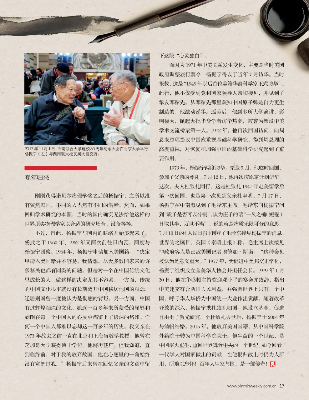 2017年11月1日,西南联合大学建校80周年纪念大会在北京大学举行,杨振宁(左)与西南联大校友吴大昌交流。