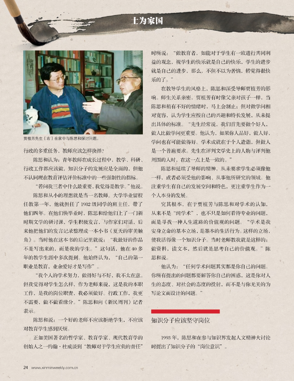 “我个人的学术努力,做得好与不好,我不太在意。但我觉得对学生怎么样,作为老师来说,这是我的本职工作,是我的岗位职责,我必须做好。行政工作,我更不需要,做不做看缘分。”陈思和向《新民周刊》记者表示。