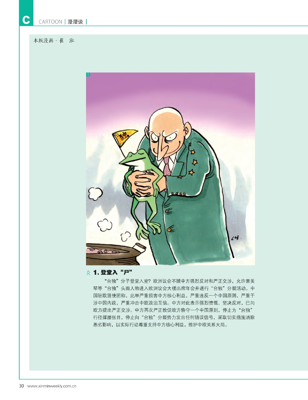 1.登堂入“尸” “台独”分子登堂入室?欧洲议会不顾中方强烈反对和严正交涉,允许萧美琴等“台独”头面人物进入欧洲议会大楼出席年会并进行“台独”分裂活动。中国驻欧盟使团称,此举严重损害中方核心利益,严重违反一个中国原则,严重干涉中国内政,严重冲击中欧政治互信。中方对此表示强烈愤慨、坚决反对,已向欧方提出严正交涉。中方再次严正敦促欧方恪守一个中国原则,停止为“台独”行径撑腰张目,停止向“台独”分裂势力发出任何错误信号,采取切实措施消除恶劣影响,以实际行动尊重支持中方核心利益,维护中欧关系大局。
