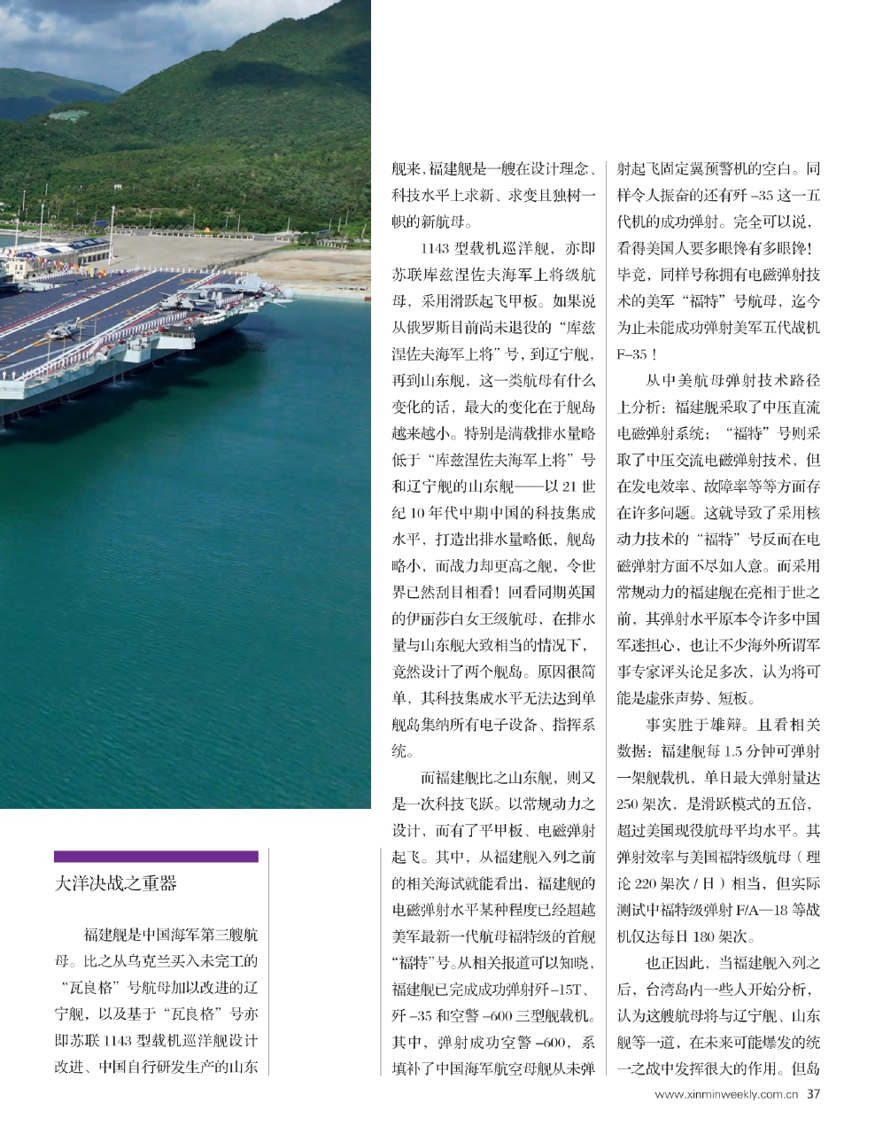 如果说如今福建舰入列,还只证明中国航母军工科技水平在部分“点”上超越了美国,而美军航母还有存量优势的话,那么未来呢?中国航母在总量上还未超越美军之际,在动力系统、弹射系统、舰载机系统方面都不输于美军航母,台海格局就必然改变。这还且不论组成航母编队的大型驱逐舰、驱逐舰、护卫舰、潜艇等等之装备水平的提升。上海政法学院教授、军事专家倪乐雄曾在相关著作中写道,“制海权是决定台湾归属的核心因素”。倪乐雄曾告诉《新民周刊》记者:“军事对抗规律与历史经验,对台海局势有着深层影响。单纯从军事上去衡量,过往的时代,民族英雄郑成功收复台湾、清代施琅攻台、甲午战争、二战后台湾光复,都显示了制海权之重要。”