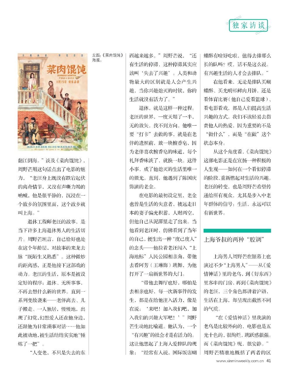 “看似平静如水,里面却是翻江倒海。”谈及《菜肉馄饨》,周野芒用这句话点出了电影的魅力,“老汪身上既没有跌宕起伏的离奇情节,又没有声嘶力竭的呐喊,他是很平静的,沉浸在一个故乡的氛围里面,这个故乡就叫上海。”