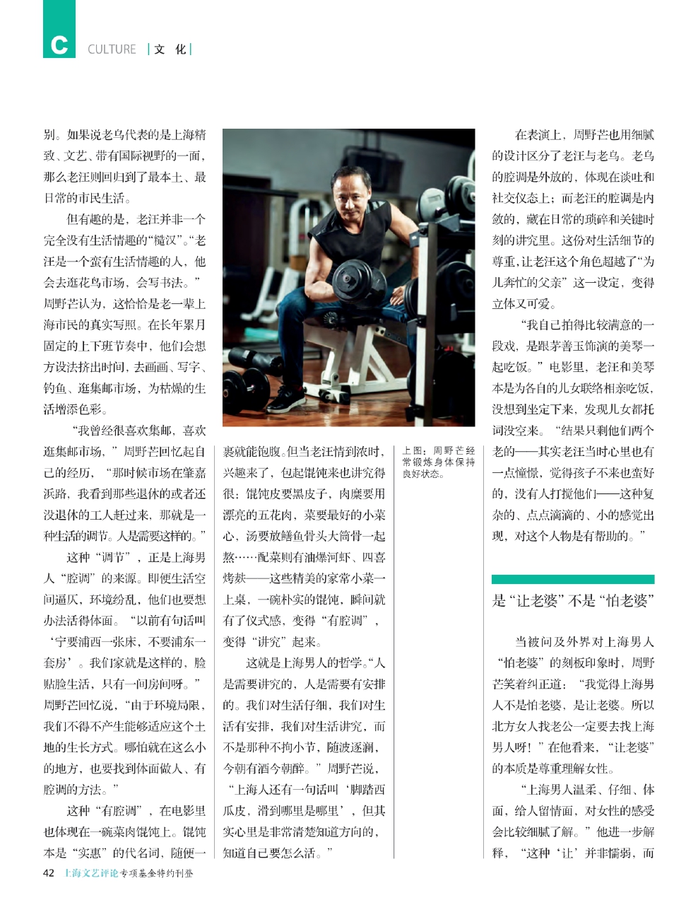 “在《爱情神话》里我演的老乌是比较外向的,电影也是五光十色的,很绚烂,跳跃感很强。而《菜肉馄饨》呢,很安静。”周野芒精准地概括了两者的区别。如果说老乌代表的是上海精致、文艺、带有国际视野的一面,那么老汪则回归到了最本土、最日常的市民生活。