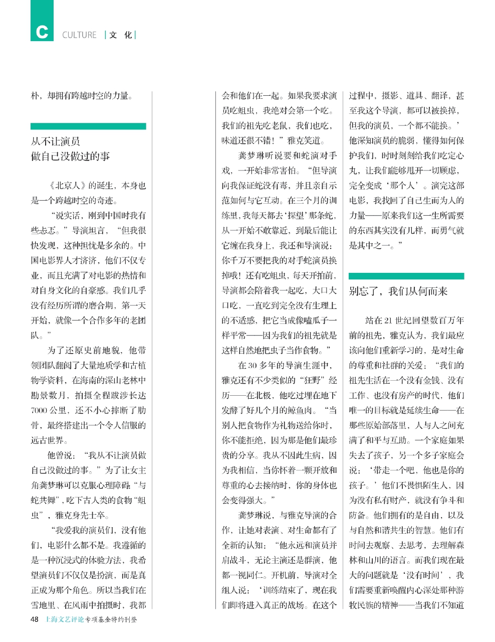 站在21世纪回望数百万年前的祖先,雅克认为,我们最应该向他们重新学习的,是对生命的尊重和社群的关爱:“我们的祖先生活在一个没有金钱、没有工作、也没有房产的时代,他们唯一的目标就是延续生命——在那些原始部落里,人与人之间充满了和平与互助。一个家庭如果失去了孩子,另一个多子家庭会说:‘带走一个吧,他也是你的孩子。’他们不畏惧陌生人,因为没有私有财产,就没有争斗和防备。他们拥有的是自由,以及与自然和谐共生的智慧。他们有时间去观察、去思考,去理解森林和山川的语言。而我们现在最大的问题就是‘没有时间’,我们需要重新唤醒内心深处那种游牧民族的精神——当我们不知道该往何处去时,停下来,看看周围,想清楚我们从何而来。”