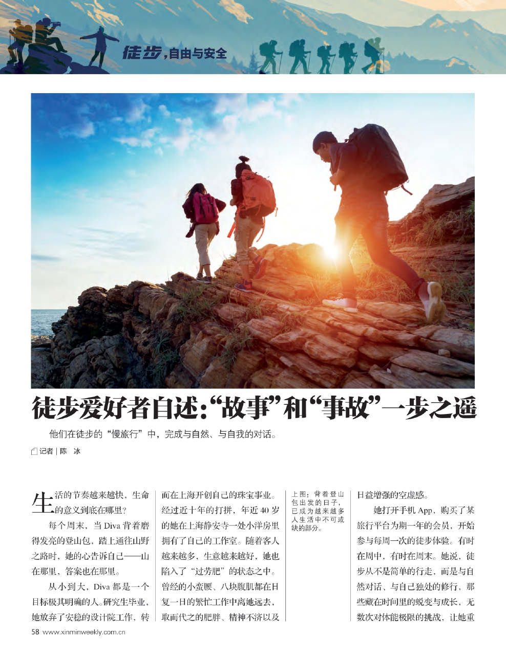 Diva告诉《新民周刊》记者:“徒步给我的馈赠,远不止沿途的风景。长期的行走让我的心肺功能愈发强健,曾经爬楼梯都气喘吁吁的我,如今单日徒步20公里也从容不迫。更珍贵的是心理上的蜕变,行走在山野间,没有城市的喧嚣与焦虑,只有风声、鸟鸣和自己的呼吸。遇到难走的路段,需要集中注意力寻找落脚点,这种专注让我暂时忘却生活中的琐事;登顶后的成就感,让我明白只要一步一个脚印,就能克服看似难以逾越的困难。”