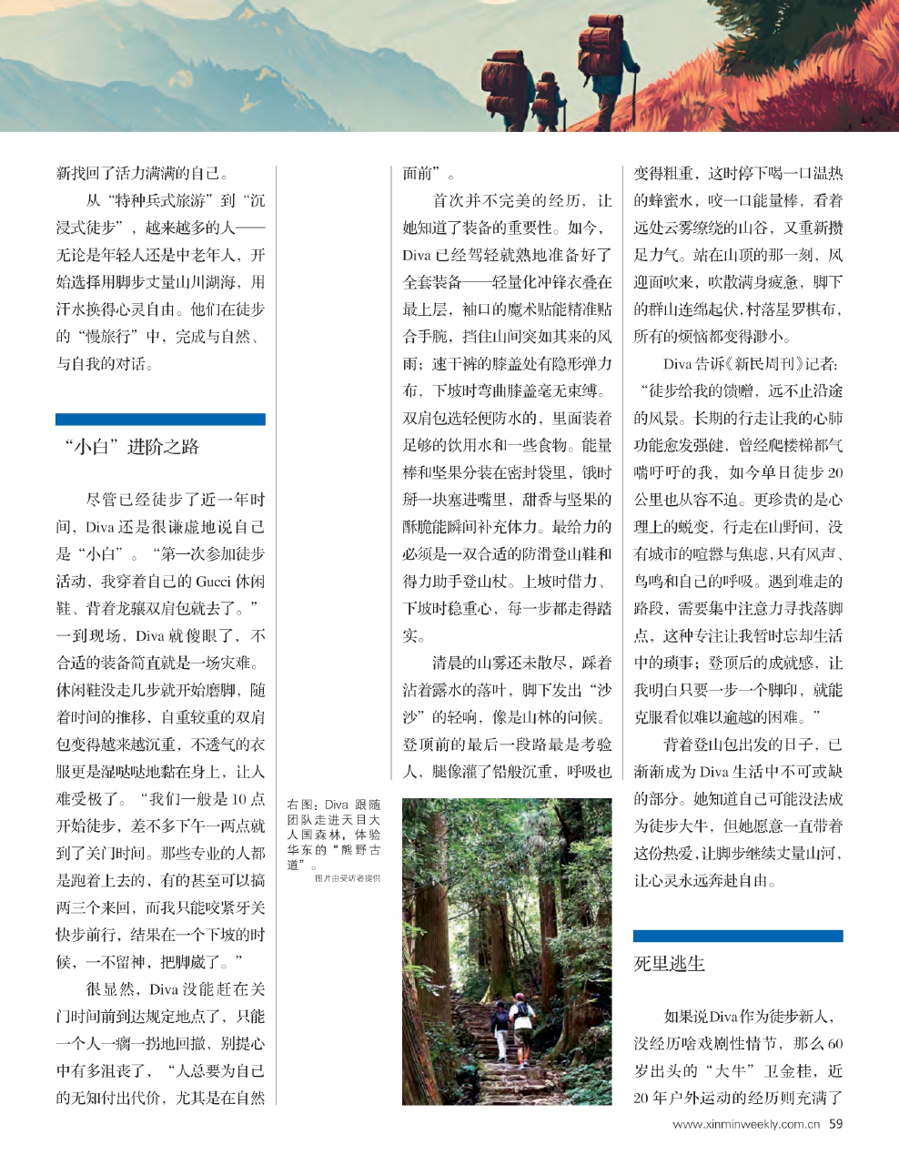 Diva告诉《新民周刊》记者:“徒步给我的馈赠,远不止沿途的风景。长期的行走让我的心肺功能愈发强健,曾经爬楼梯都气喘吁吁的我,如今单日徒步20公里也从容不迫。更珍贵的是心理上的蜕变,行走在山野间,没有城市的喧嚣与焦虑,只有风声、鸟鸣和自己的呼吸。遇到难走的路段,需要集中注意力寻找落脚点,这种专注让我暂时忘却生活中的琐事;登顶后的成就感,让我明白只要一步一个脚印,就能克服看似难以逾越的困难。”