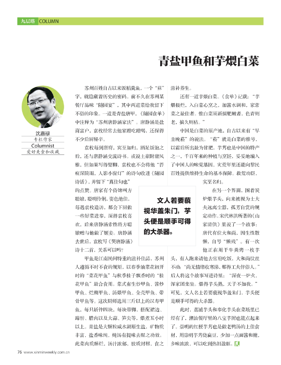 苏州百姓自古以来饭稻羹鱼,一个“蘇”字,就隐藏着历史的密码。前不久在苏州某餐厅品味“随园宴”,其中两道菜给我留下不俗的印象。一道是青盐唐甲,《随园食单》中注释为“苏州唐静涵家法”。唐静涵是盐商富户,袁枚经常去他家蹭吃蹭喝,还探得不少后厨秘辛。