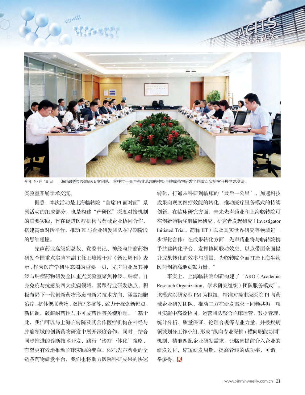 先声药业高级副总裁、党委书记、神经与肿瘤药物研发全国重点实验室副主任王峰博士对《新民周刊》表示,作为医产学研生态圈的重要一员,先声药业及其神经与肿瘤药物研发全国重点实验室聚焦神经、肿瘤、自身免疫与抗感染四大疾病领域,紧跟行业研发热点,积极布局下一代创新药物形态与新兴技术方向,涵盖细胞治疗、抗体偶联药物、双抗/多抗等,致力于探索新靶点、新机制,破解耐药性与不可成药性等关键难题。“基于此,我们可以与上海临转院及其合作医疗机构在神经与肿瘤领域的创新药物研发中展开深度合作。同时,结合同步推进的诊断技术开发,践行‘诊疗一体化’策略,有望更有效地推动临床实践的变革。依托先声药业的全链条药物研发平台,我们也将助力医院科研成果的快速转化,打通从科研到临床的‘最后一公里’,加速科技成果向现实医疗效能的转化,推动医疗服务模式的持续创新。在临床研究方面,未来先声药业和上海临转院可在创新药物注册临床研究、研究者发起研究(Investigator Initiated Trial,简称IIT)以及真实世界研究等领域进一步深化合作;在成果转化方面,先声药业将与临转院携手共建转化平台,发挥协同联动效应,以点带面全面提升成果转化的效率与质量,为临转院全面打造上海生物医药创新高地贡献力量。”