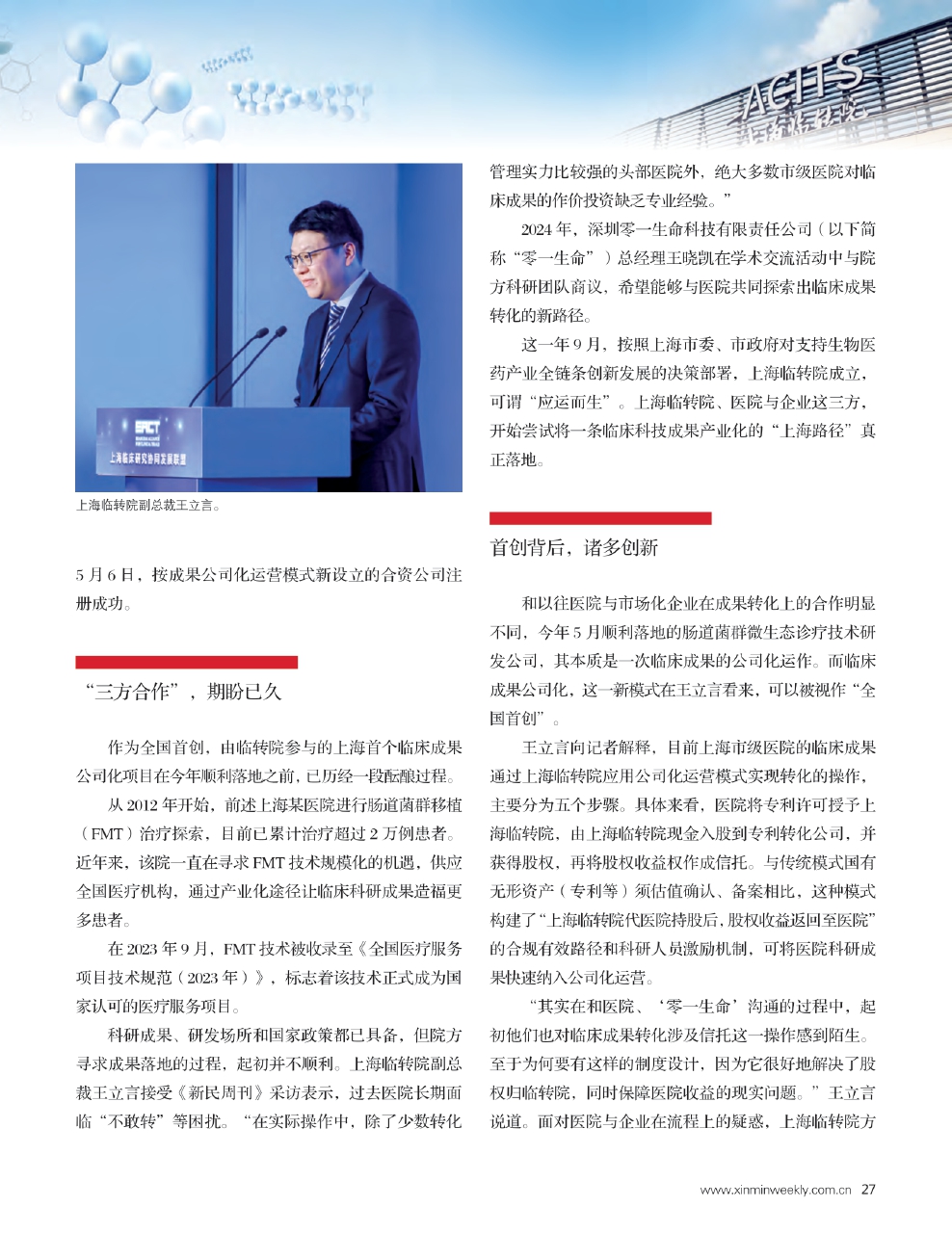 科研成果、研发场所和国家政策都已具备,但院方寻求成果落地的过程,起初并不顺利。上海临转院副总裁王立言接受《新民周刊》采访表示,过去医院长期面临“不敢转”等困扰。“在实际操作中,除了少数转化管理实力比较强的头部医院外,绝大多数市级医院对临床成果的作价投资缺乏专业经验。”