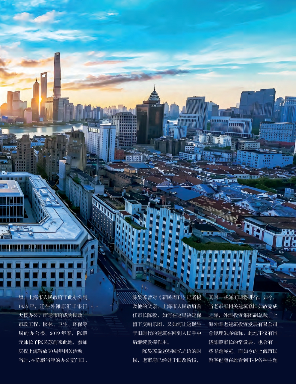 陈昊苏说这些回忆之语的时候,老市府已经处于旧改阶段,其时一些施工即将进行。如今,当老市府相关建筑修旧如故完成之际,外滩投资集团副总裁、上海外滩老建筑投资发展有限公司总经理朱亦锋称,此地不仅有围绕陈毅市长的常设展,也会有一些专题展览。而如今的上海市民游客也能在此看到不少各种主题的文化活动。曾经的老市府,将成为上海都市文化的一个新符号!