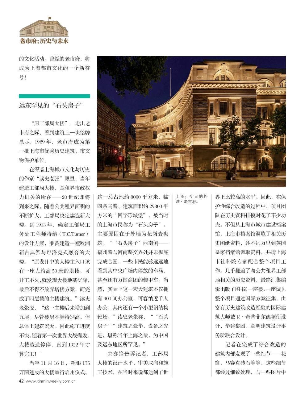 朱亦锋告诉记者,工部局大楼的设计水平、审美取向和施工技术,在当时来说都达到了世界上比较高的水平。因此,在保护性综合改造的过程中,项目团队在历史资料排摸时花了不少功夫。不但从上海市城市建设档案馆、上海市档案馆调取了相关历史图纸资料,还不远万里到英国皇家档案馆调取资料,并请上海市社科院专家配合整个项目工作。几乎翻遍了与公共租界工部局相关的历史资料,最终汇集编辑出版了图书《一座楼、一座城》。整个项目通过国际方案征集,由富有历史建筑改造经验的国际建筑大师戴卫·奇普菲尔德领衔设计,华建集团、章明建筑设计事务所联合设计。