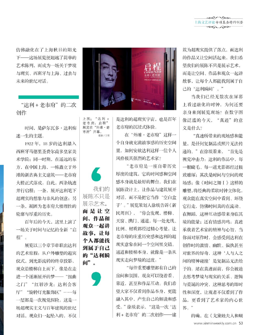 “老市府是一座自带历史厚度的建筑,它的时间感和空间感本身就是最好的舞台。我们在展陈设计上,让作品与建筑展开对话,而不是把它当作‘空白盒子’。”展览策划人徐琰告诉《新民周刊》,“你会发现,楼梯、天窗、拱门、通道,每一处光线、比例、材质都经过精心考量,让老市府的庄重历史感和达利的超现实意象在同一个空间里交错。通道和楼梯本身,就像是一条从现实走向梦境的过渡。”