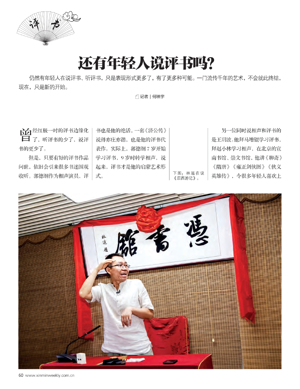 北京作家林遥的另一个身份是说书人。每周六下午3点至5点,他都会准时来到北京延庆文艺实践基地(新华书店)内的“凭书馆”进行现场评书演出。