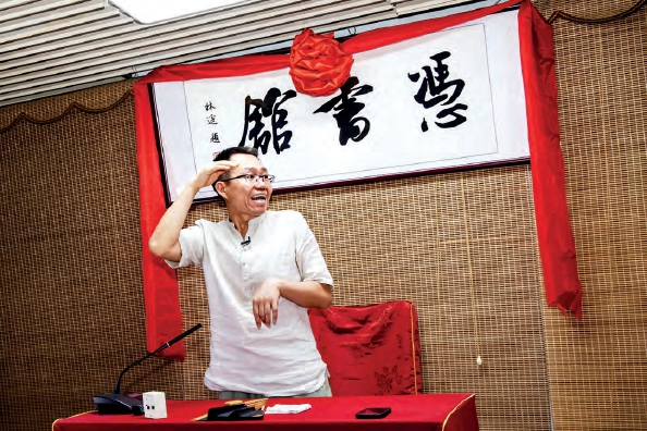 北京作家林遥的另一个身份是说书人。每周六下午3点至5点,他都会准时来到北京延庆文艺实践基地(新华书店)内的“凭书馆”进行现场评书演出。