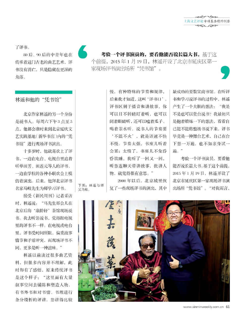 考验一个评书演员,要看他能否说长篇大书。基于这个前提,2015年1月19日,林遥开设了北京市延庆区第一家现场评书演出场所“凭书馆”。“对我而言,坚持10年的现场评书演出的原因就在于此。有了每周六的登台,我可以随时检讨自己,寻找自己的不足,也能够去体会当年老艺人、老先生在现场说书过程中留下的经验。”