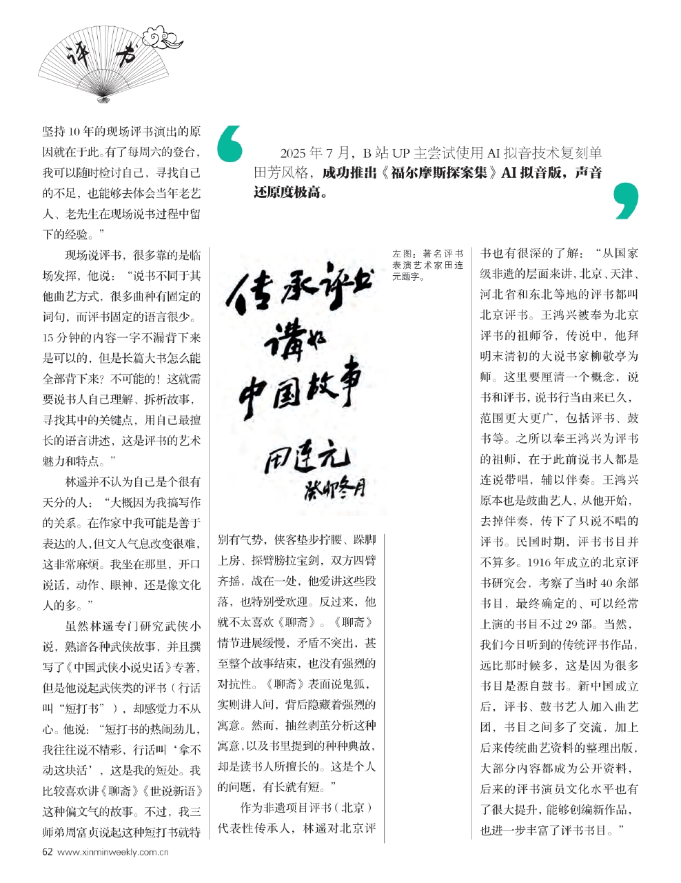 林遥以前读过很多曲艺资料,但很多内容并不理解,此时却有了感悟,原来传统评书是这个样子:“这里面有大量叙事空间去铺陈和塑造人物,有书外书和对书情、书理进行条分缕析的评讲。怹讲得比较慢,有种特殊的节奏和规律,后来我才知道,这叫‘评书口’。评书区别于播音和讲故事,你可以目不转睛盯着听,也可以闭着眼睛听,还可以嗑着瓜子、喝着茶水听。说书人的节奏要‘不温不火’,就是语速不快不慢。节奏太强,书座儿听着会累;太慢了,书座儿不免昏昏欲睡。我听了一回又一回,听怹连聊天带讲故事,批讲人物,就觉得很有意思。”