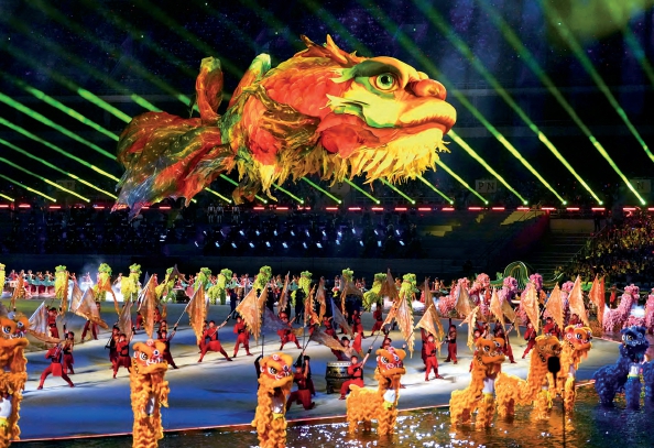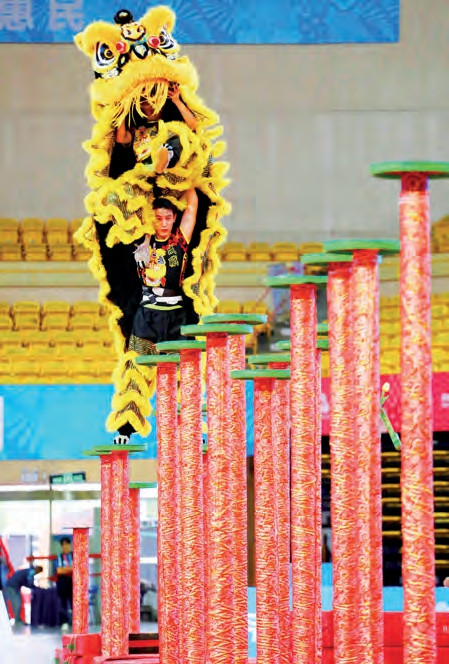 下图:2025年11月11日,广东佛山,第十五届全国运动会群众展演舞龙舞狮项目决赛在佛山岭南明珠体育馆拉开帷幕。