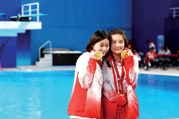 上图:11月11日,第十五届全国运动会跳水项目在广东省奥体中心游泳跳水馆迎来最后一个比赛日。图为女子3米跳板决赛结束后,全红婵(左)和王伟莹持金牌在馆内合影。