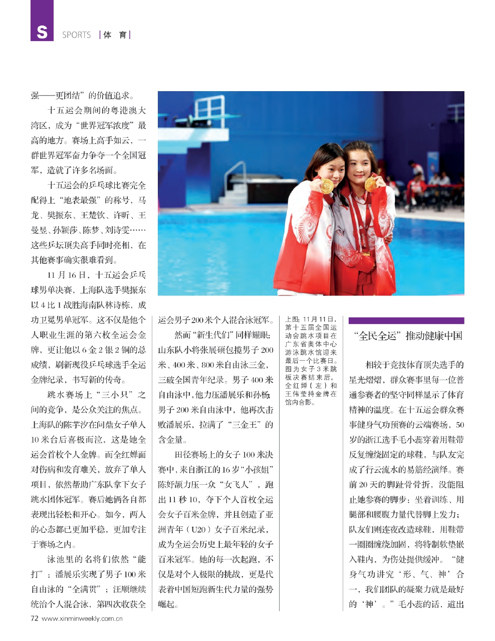 第十五届全运会书写了全运史上的新篇章。这场体育盛会不仅是“一国两制”在体育领域的鲜活实践,更是体育强国建设的重要里程碑。全运会正以更温暖、更包容的姿态,为健康中国注入源源不断的动力。