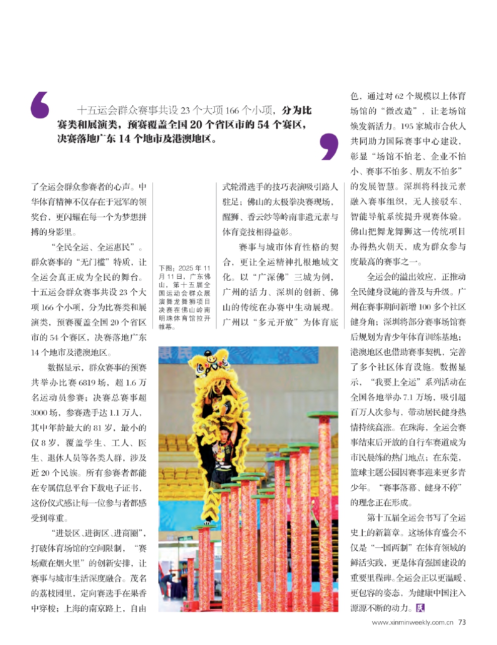 “全民全运、全运惠民”。群众赛事的“无门槛”特质,让全运会真正成为全民的舞台。十五运会群众赛事共设23个大项166个小项,分为比赛类和展演类,预赛覆盖全国20个省区市的54个赛区,决赛落地广东14个地市及港澳地区。