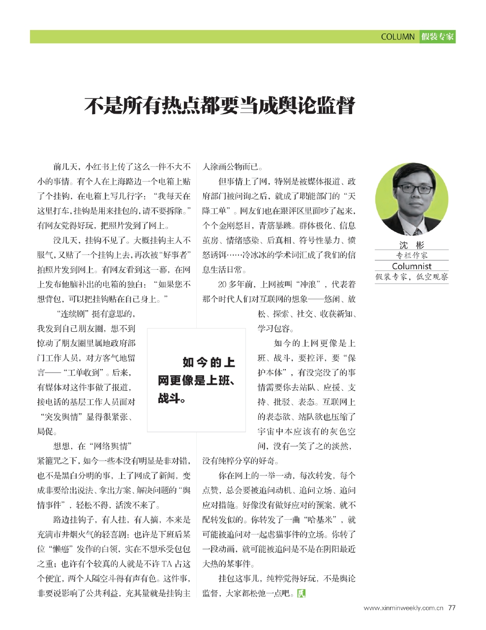 想想,在“网络舆情”紧箍咒之下,如今一些本没有明显是非对错,也不是黑白分明的事,上了网成了新闻,变成非要给出说法、拿出方案、解决问题的“舆情事件”,轻松不得,活泼不来了。