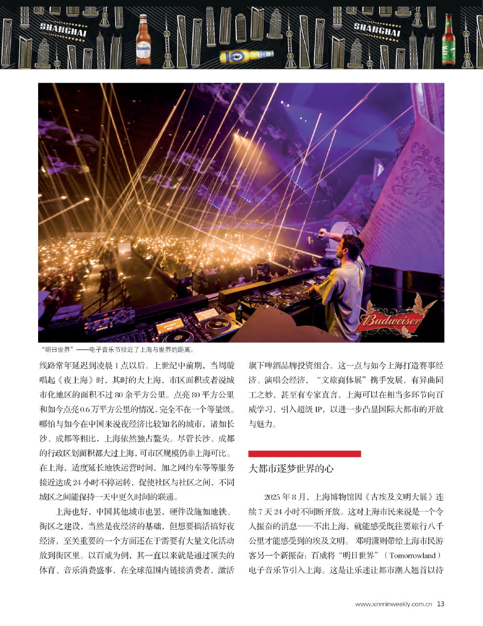 2025年8月,上海博物馆因《古埃及文明大展》连续7天24小时不间断开放。这对上海市民来说是一个令人振奋的消息——不出上海,就能感受既往要旅行八千公里才能感受到的埃及文明。邓明潇则带给上海市民游客另一个新振奋:百威将“明日世界”(Tomorrowland)电子音乐节引入上海。这是让乐迷让都市潮人翘首以待的节日,亦让上海距离世界更近——那是一种生活方式的契合,也是一种心灵的应和。