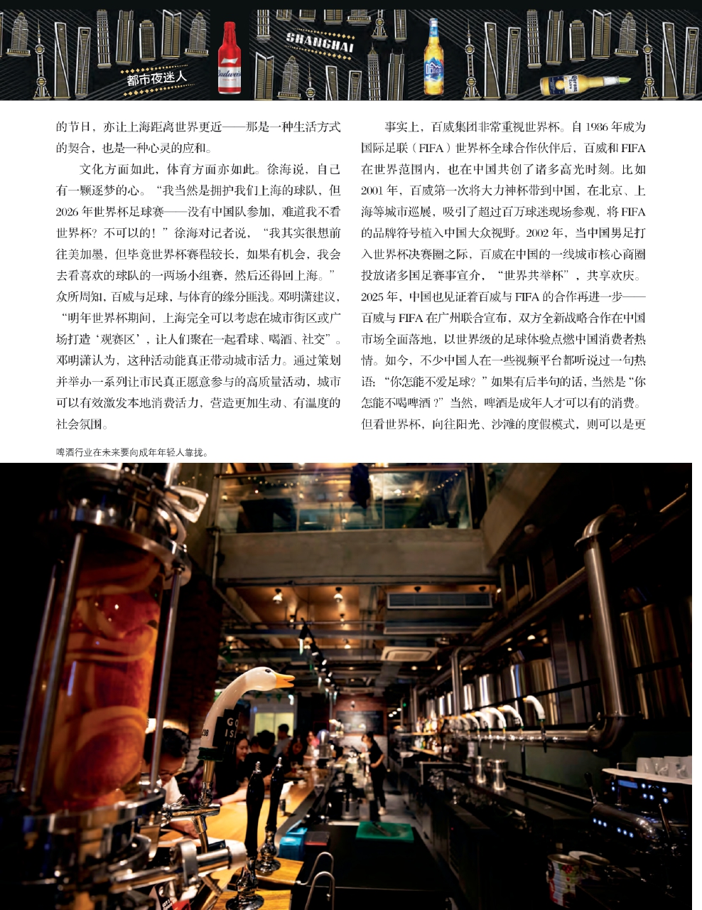 文化方面如此,体育方面亦如此。徐海说,自己有一颗逐梦的心。“我当然是拥护我们上海的球队,但2026年世界杯足球赛——没有中国队参加,难道我不看世界杯?不可以的!”徐海对记者说,“我其实很想前往美加墨,但毕竟世界杯赛程较长,如果有机会,我会去看喜欢的球队的一两场小组赛,然后还得回上海。”众所周知,百威与足球,与体育的缘分匪浅。邓明潇建议,“明年世界杯期间,上海完全可以考虑在城市街区或广场打造‘观赛区’,让人们聚在一起看球、喝酒、社交”。邓明潇认为,这种活动能真正带动城市活力。通过策划并举办一系列让市民真正愿意参与的高质量活动,城市可以有效激发本地消费活力,营造更加生动、有温度的社会氛围。