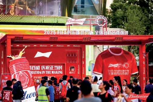 一堵巨大的“荣耀主场”球衣墙与百威快闪酒吧吸引了无数球迷与游客驻足。这里不是赛场,却充斥着比赛的激情:巨型屏幕播放着世俱杯赛事信息,球迷的欢呼与举杯的瞬间被镜头捕捉,与广场区域的“百威红”一同,汇入城市的夜色。