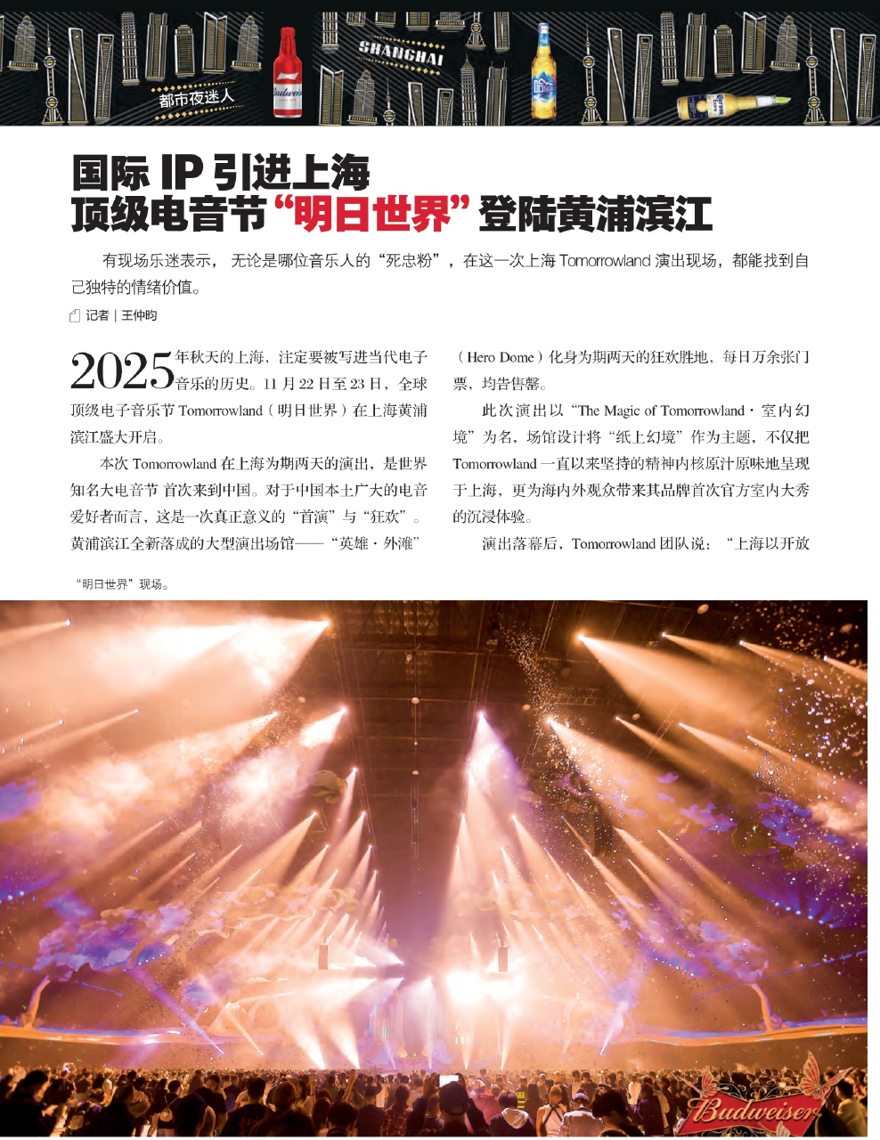 《新民周刊》了解到,2024年,百威集团积极与Tomorrowland品牌方对接,寻找合适的场地与执行公司,各方全力以赴,最终确定了这一电音节能够于2025年11月在上海,通过首次室内演出的形式与乐迷见面。