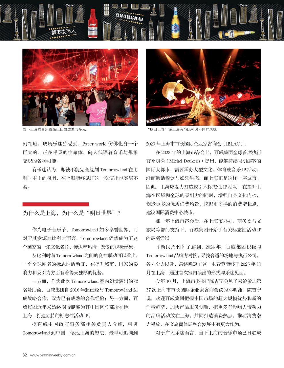 《新民周刊》了解到,2024年,百威集团积极与Tomorrowland品牌方对接,寻找合适的场地与执行公司,各方全力以赴,最终确定了这一电音节能够于2025年11月在上海,通过首次室内演出的形式与乐迷见面。