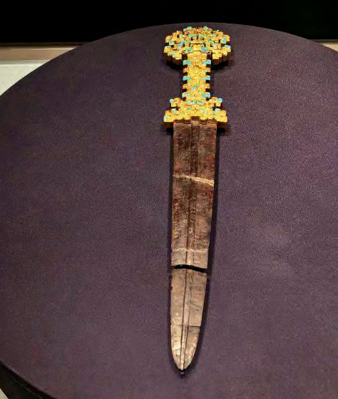 比倗矛更凡尔赛的,是出土于陕西宝鸡的金柄铁剑。它的剑柄是纯金打造的,装饰蟠虺纹、饕餮纹及曾面纹饰,镶嵌绿松石与彩色料珠,极尽奢华。而它的剑身,竟然是铁制的。在青铜仍是主流的时代,铁是极其稀有和前沿的材料。它几乎无法用于实战,金质剑柄过软,早期的铁剑身也易折——它的存在,纯粹是为了彰显主人无与伦比的财富、权力和与远方文明的贸易联系,是地位超然的象征。