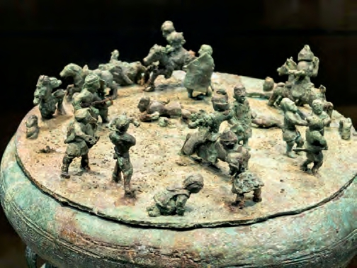 这种社交属性甚至延伸到了记录战功的方式上。在云南出土的战争场面铜贮贝器,盖子本身就是一组立体雕塑,生动地刻画了一场血腥战争的瞬间:骑士冲锋、战士搏杀、俘虏受刑。整个场景被永久地固化在贵族用于储存海贝(当时的货币)的宝器顶上。这无异于在说:“我的财富,正是建立在这样的武力之上。”它将暴力美学、财富炫耀和社会权力赤裸裸地结合在一起,表达了兵器的“社交属性”。