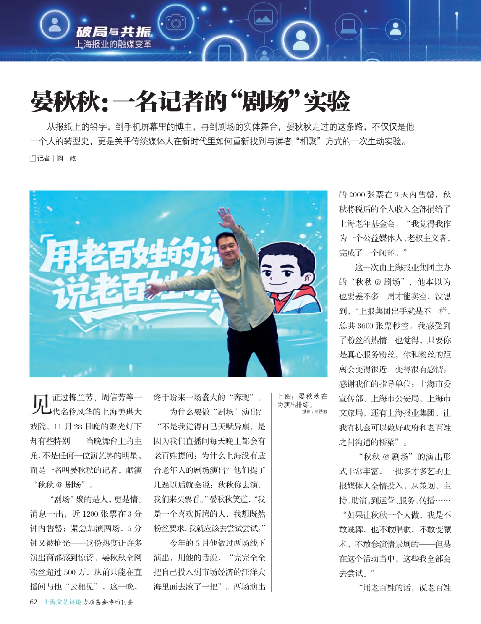 虽然已经是一名拥有500万粉丝的民生大V,晏秋秋却说,自己仍然在“山踝”,离“山腰”都还有很长距离。“我一直觉得我是一个很幸运的人,我想加速奔跑的时候,集团就给我一双溜冰鞋。最近上报集团推出‘IP星链工场’,核心就是关注IP的影响力怎么转化为市场的吸引力,我觉得特别好。在集团指挥下,我们这次做‘剧场’演出,就是一次清晰的实践。我曾经说,转型是给我一面镜子,让我更加看清自己——而现在,我又拥有了新的镜子——我在什么领域有吸引力,我在什么领域有发展的潜力,都能映照出来。”