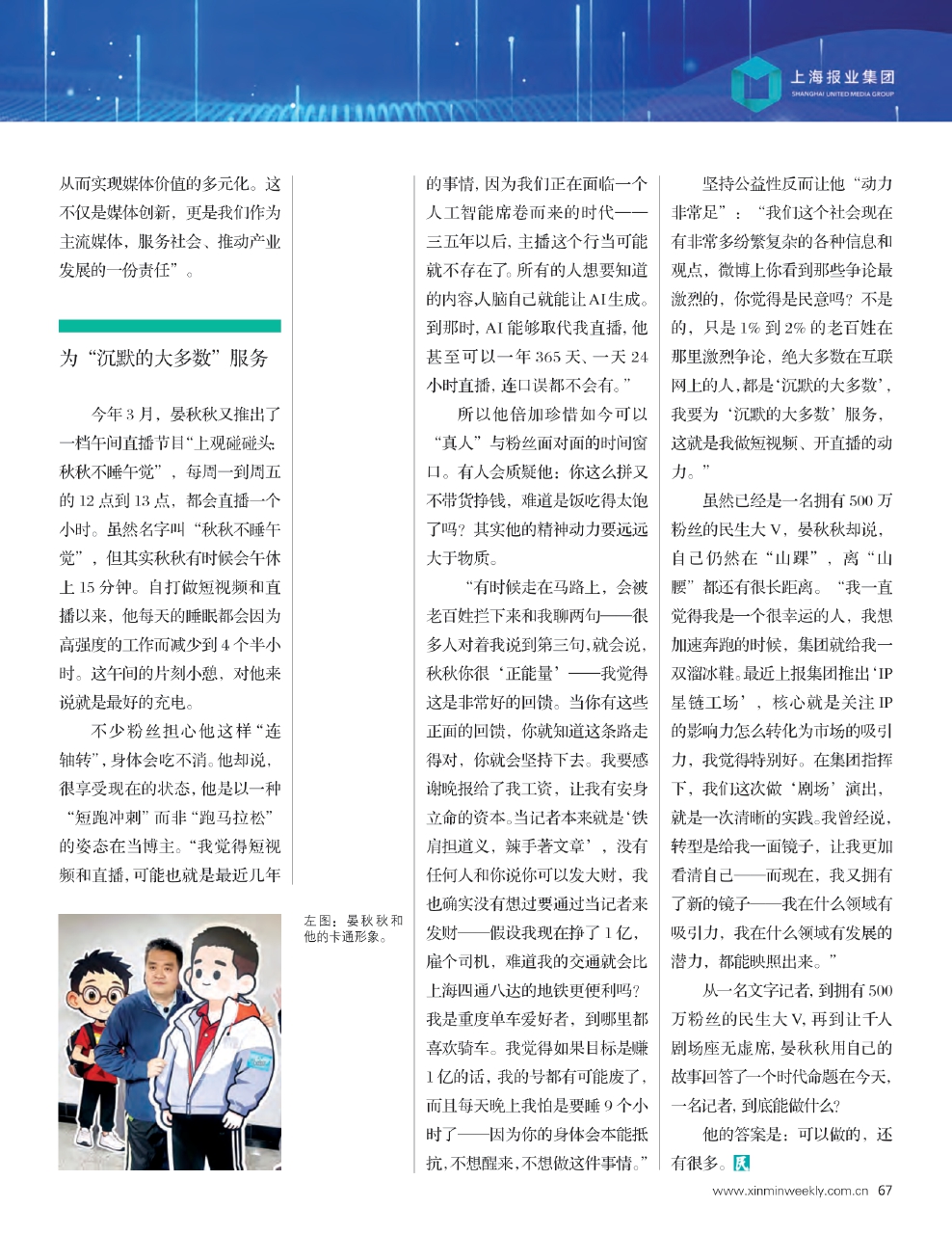 至今,他仍然会每天花数小时阅读网友评论。“有些评论让你了解他们在想什么,有些评论是在给我提供新闻选题——每天晚上直播间里,如果同一类的问题有10个以上的观众提问,我就会在第二天把它做成视频。有时候相关部门会问我:秋秋,你为什么现在突然想到要解读一个2016年的政策?我说因为老百姓不知道呀,老百姓在问呀——他们问的就是我们应该回答的。现在的新闻不一定是今时今日的‘新’,而是老百姓关心什么,是民心的‘心’,是‘心’闻。我们传统媒体人,服务老百姓本来就是应有之义,我一直觉得,这就是《新民晚报》这样一张‘飞入寻常百姓家’的报纸应该做的内容。”