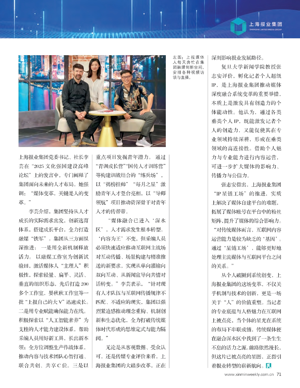 为何要培育记者个人IP?上海报业集团党委书记、社长李芸在“2025文化强国建设高峰论坛”上的发言中,专门阐释了集团面向未来的人才布局。她强调:“媒体变革,关键是人的变革。”