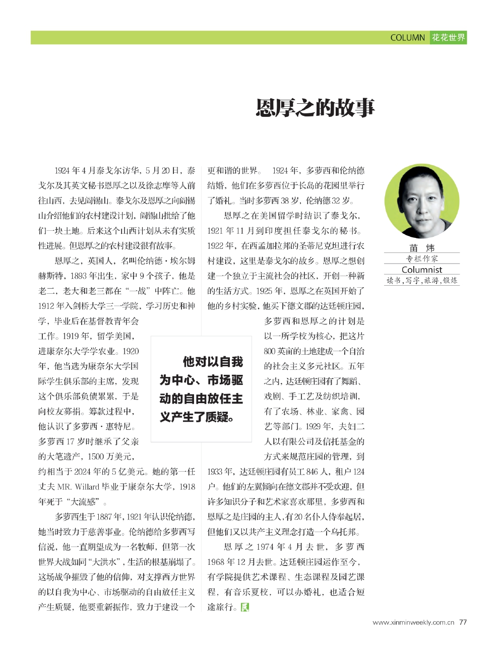 恩厚之,英国人,名叫伦纳德·埃尔姆赫斯特,1893年出生,家中9个孩子,他是老二,老大和老三都在“一战”中阵亡。他1912年入剑桥大学三一学院,学习历史和神学,毕业后在基督教青年会工作。1919年,留学美国,进康奈尔大学学农业。1920年,他当选为康奈尔大学国际学生俱乐部的主席,发现这个俱乐部负债累累,于是向校友募捐。筹款过程中,他认识了多萝西·惠特尼。多萝西17岁时继承了父亲的大笔遗产,1500万美元,约相当于2024年的5亿美元。她的第一任丈夫MR.Willard毕业于康奈尔大学,1918年死于“大流感”。
