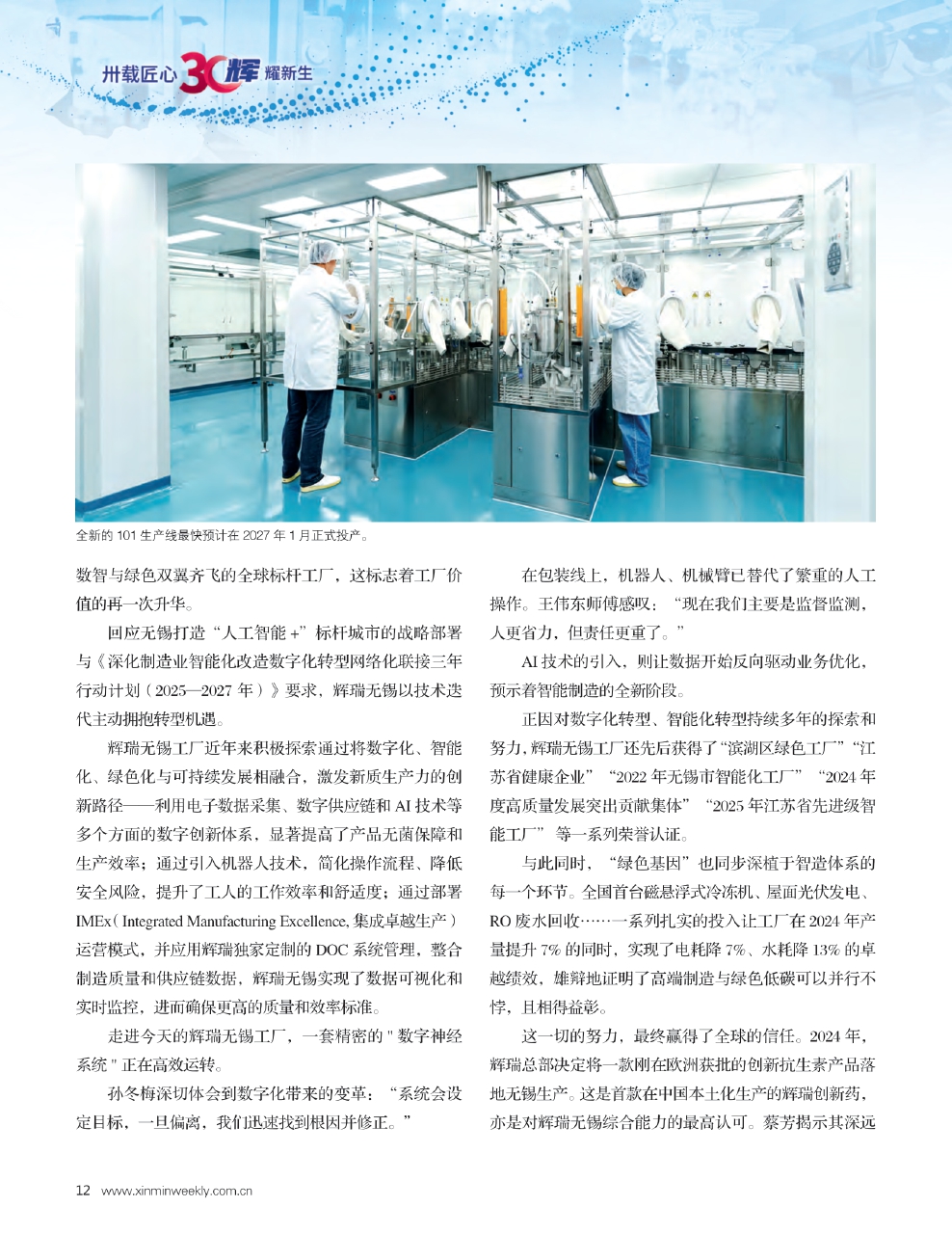 这一切的努力,最终赢得了全球的信任。2024年,辉瑞总部决定将一款刚在欧洲获批的创新抗生素产品落地无锡生产。这是首款在中国本土化生产的辉瑞创新药,亦是对辉瑞无锡综合能力的最高认可。蔡芳揭示其深远意义:这条全新的抗生素生产线,标志着无锡工厂从抗肿瘤领域向抗感染领域的战略拓展,“更体现了辉瑞对中国市场和患者的承诺”。