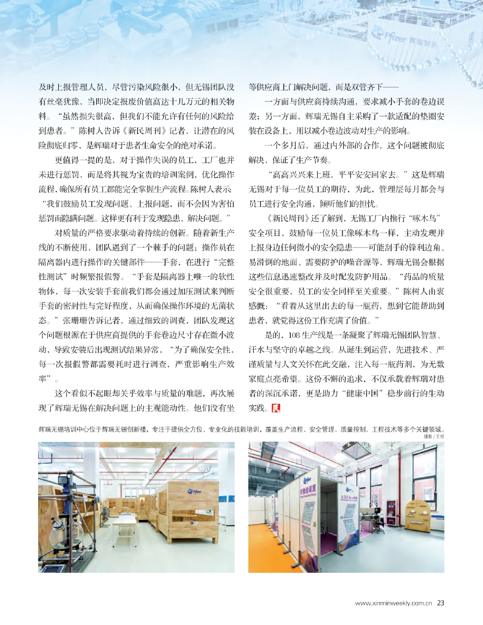 《新民周刊》还了解到,无锡工厂内推行“啄木鸟”安全项目,鼓励每一位员工像啄木鸟一样,主动发现并上报身边任何微小的安全隐患——可能刮手的锋利边角、易滑倒的地面、需要防护的噪音源等,辉瑞无锡会根据这些信息迅速整改并及时配发防护用品。“药品的质量安全很重要,员工的安全同样至关重要。”陈树人由衷感慨:“看着从这里出去的每一瓶药,想到它能帮助到患者,就觉得这份工作充满了价值。”